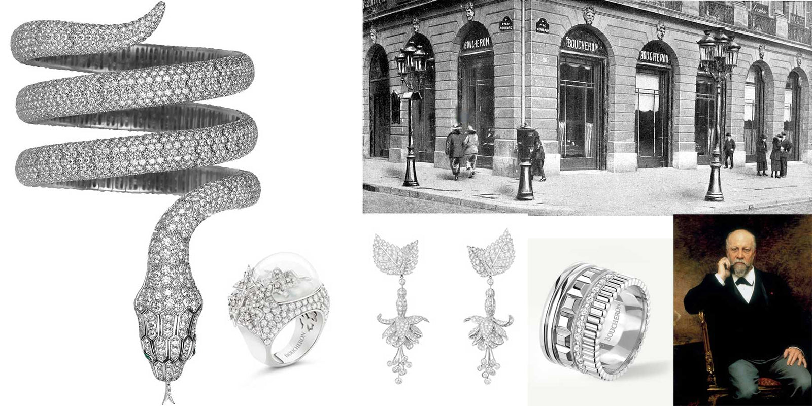 The House of Boucheron is a French family dynasty founded by Frederic Boucheron in 1858, with the opening of his first store in the Galerie de Valois, at Palais-Royal, during the heyday of the Second French Empire. He created his atelier in 1866 and a year later won the Gold Medal during the Exposition Universelle.
